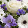 Featuring white large headed rose, white germini, white spray chrysanthemums and purple freesia with purple statice, salal and pittosporum, in a blue curved glass vase with light blue sisal collar and presented in Interflora Gift Packaging.