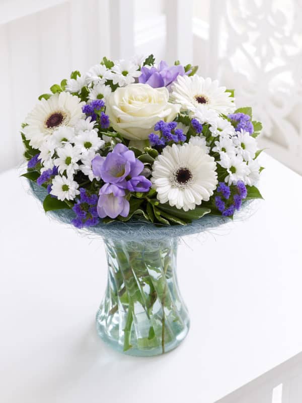 These fabulous cool lilac, blue and purple tones look sensational partnered with pristine white blooms and interspersed with greenery. We’ve arranged everything beautifully in a pretty glass vase to create a fresh, uplifting display that will look lovely in any room.