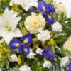 Asiatic lilies and carnations are presented with irises, spray carnations and choice foliage to create this lemon and blue teardrop spray.