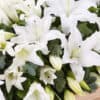 A blanket of Oriental lilies is beautifully complemented by an array of luxurious deep green leaves to create this simple but striking casket spray.