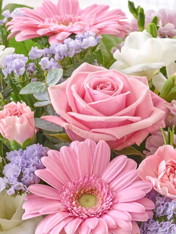Featuring white freesia, pink germini, pink rose, pink spray chrysanthemums, pink spray carnation and lilac statice with eucalyptus, rosemary and salal tips, presented in a pretty floral design gift box.