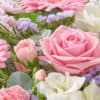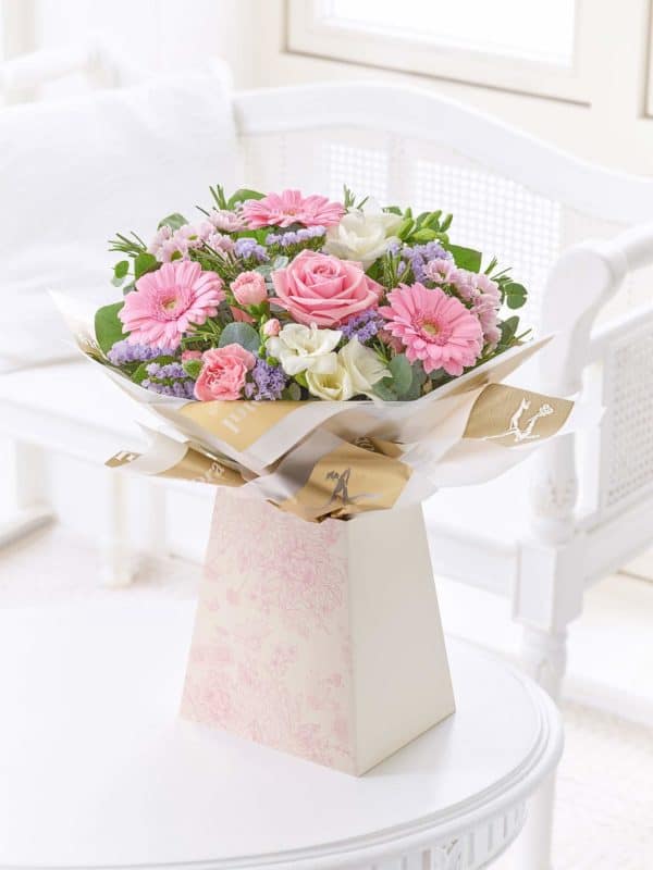 Featuring white freesia, pink germini, pink rose, pink spray chrysanthemums, pink spray carnation and lilac statice with eucalyptus, rosemary and salal tips, presented in a pretty floral design gift box.
