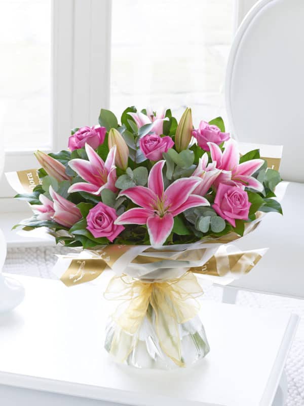 Featuring pink large-headed roses with pink Oriental lilies, eucalyptus and salal leaves, hand-tied and presented in Interflora Gift Packaging.