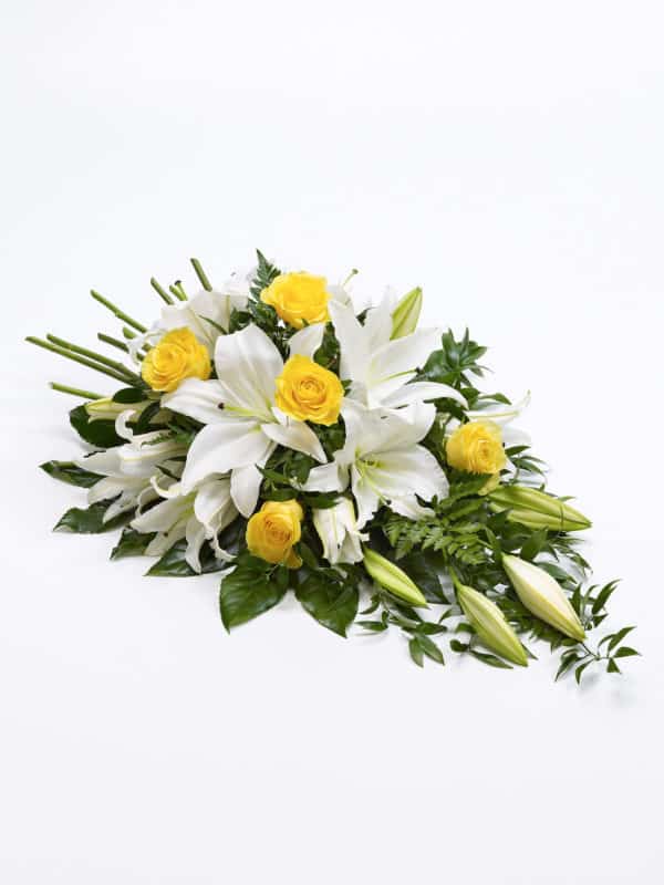 Aralia leaves and French ruscus are nestled amongst classic Oriental lilies and large-headed roses in this classic teardrop spray.