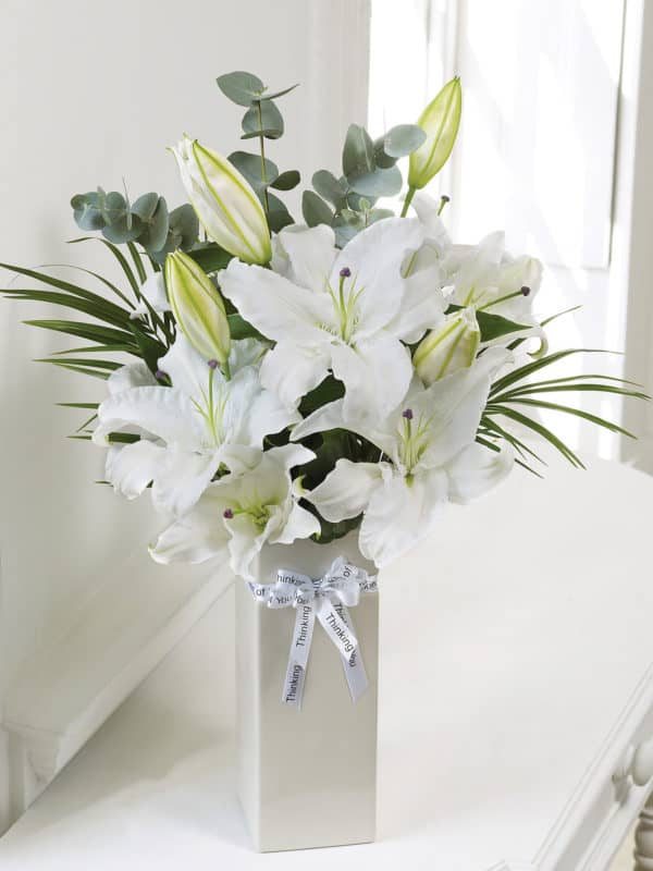 Featuring white Oriental lilies, palm leaves, eucalyptus and salal presented in a ceramic vase and finished with a ‘thinking of you’ ribbon.