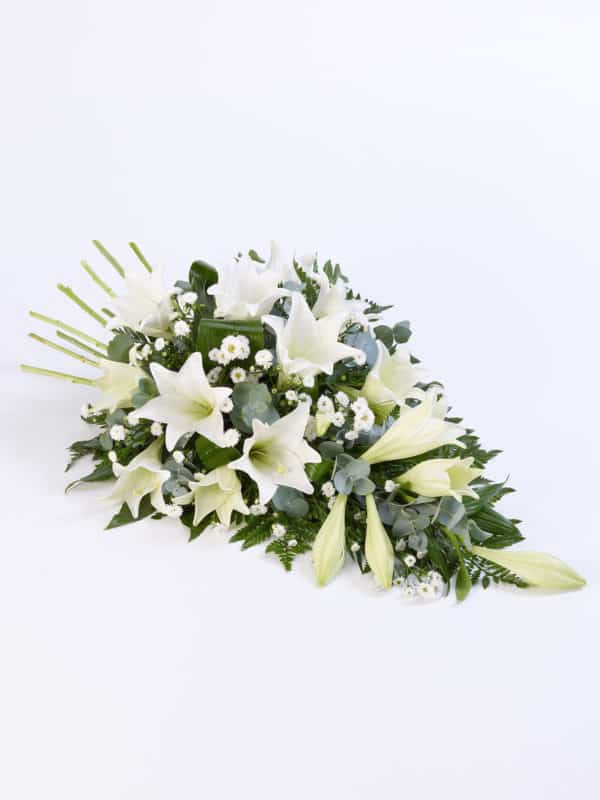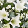Classic white Longiflorum lilies are beautifully complemented by white September flower and choice foliages to create this elegant spray.