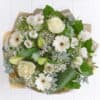 Featuring white germini, white gypsophila, white Oriental lily, white lisianthus and ivory large-headed roses hand-tied with aspidistra leaf, salal and eucalyptus and finished with gift wrap and gold voile ribbon.
