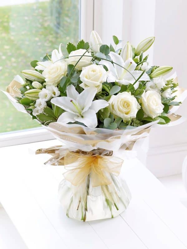 Featuring white large-headed roses, with white Oriental lilies and white lisianthus hand-tied with steel grass, salal, eucalyptus and pittosporum and presented in Interflora Gift Packaging.
